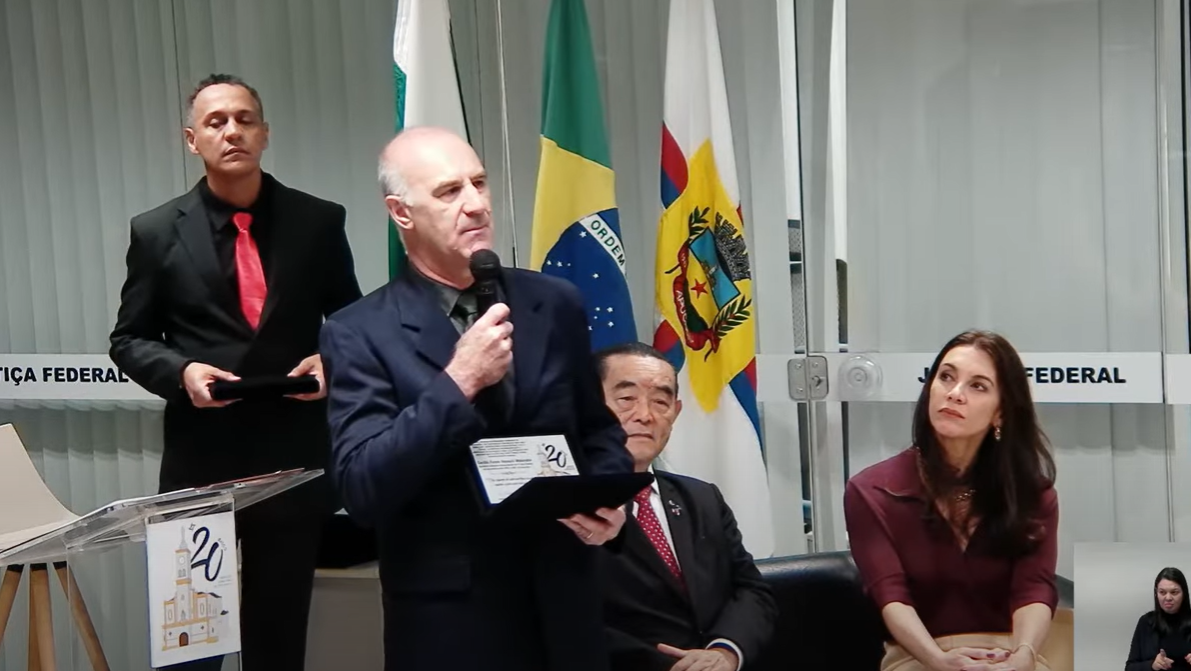 Servidor pioneiro Paulo Sergio Sanches, um dos homenageados na solenidade (Reprodução Youtube/JFPR no Ar)