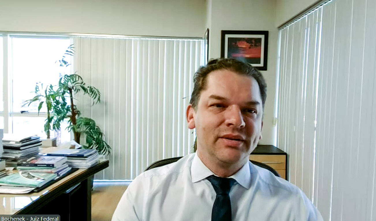 O juiz federal Antônio César Bochenek, coordenador das Demandas Estruturais do Sistcon, apresentou o painel sobre a destinação de valores de ações judiciais para soluções socioambientais (Imagem: Sistcon/TRF4)