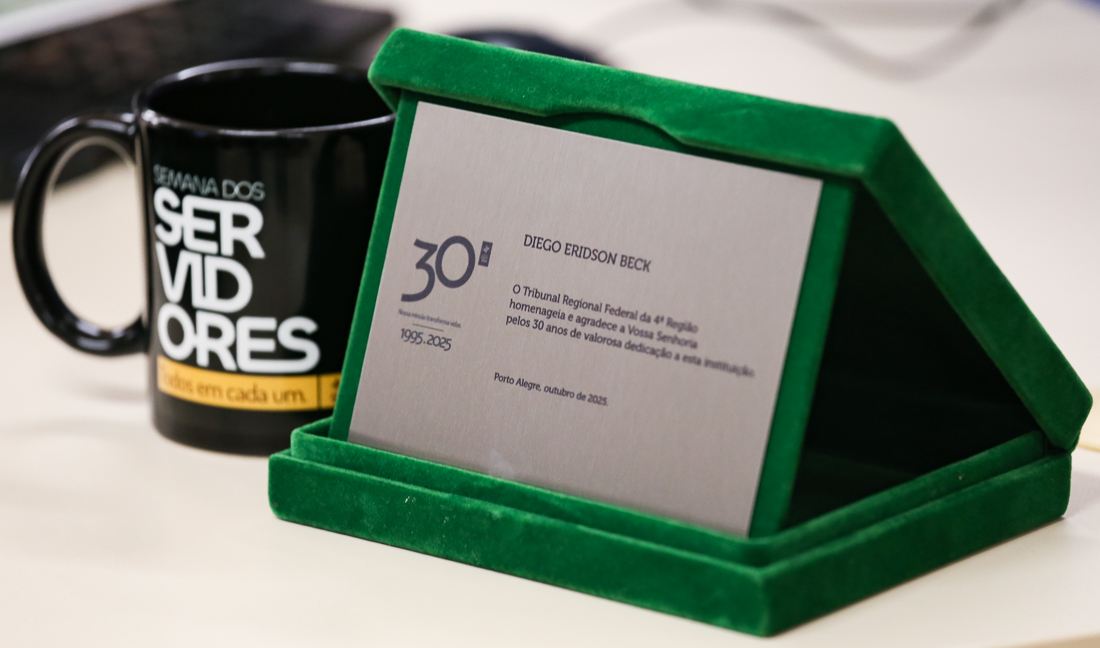 Além das placas, os servidores homenageados também receberam uma caneca comemorativa aos 30 anos de carreira no TRF4. Após a entrega das homenagens, foi realizada uma confraternização para que os servidores e servidoras pudessem relembrar um pouco da própria história.